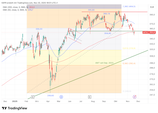 Seit dem Sommer bewegt sich MTU recht lustlos zwischen 354,40 und 395,80 Euro seitwärts. Anleger warten auf klare Signale. Ein deutlicher Vorteil für die Verkäufer entsteht, sobald die Aktie auf Tagesbasis unter 346,90 Euro fällt. Damit würde sie die Handelsspanne der letzten Monate verlassen und erstes Abwärtspotenzial bis 337,30 Euro eröffnen.