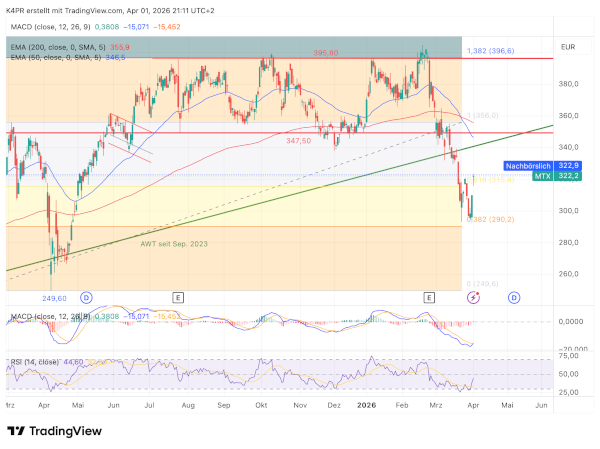 Im Vergleich zum starken Rückgang während des Zollschocks im April des letzten Jahres hielt sich die Aktie diesmal stabiler. Im Bereich von 294,00 Euro konnte sie sich deutlich behaupten und im gestrigen Handel sogar über die wichtige Marke von 320,20 Euro steigen. Das erhöht die Chancen auf eine mehrtägige Erholung. Mögliche nächste Ziele liegen zunächst bei 335,00 Euro und darüber im Bereich der beiden gleitenden Durchschnitte EMA 50 und EMA 200 zwischen 346,50 und 355,90 Euro. Diese Entwicklung könnte vor allem für kurzfristig orientierte Anleger interessant sein, die auf vorübergehende Kursgewinne setzen.