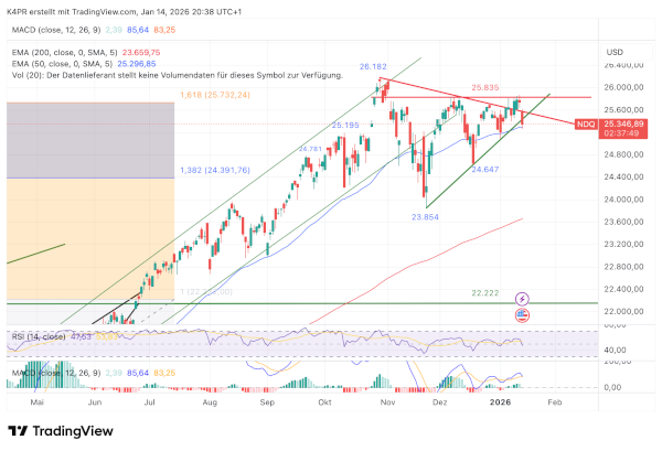 Gelingt es dem NASDAQ 100 hingegen, die Marke von 25.800 Punkten und anschließend das bisherige Rekordhoch zu überwinden, wäre auch wieder Platz für neue Kursgewinne. Dann könnte der Index erneut in Richtung neuer Höchststände vorstoßen.