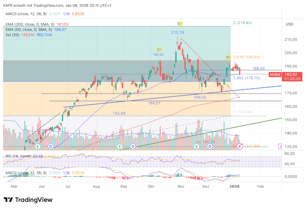 Die einstigen Zugpferde der US-Aktienmärkte, die Magnificent Seven, haben ihre Aufwärtsdynamik in den letzten Wochen sichtlich verlangsamt und sind grob umschrieben, in eine Seitwärtsphase übergegangen. Bei manchen Wertpapieren häufen sich die Anzeichen jedoch zu einem ausgewachsenen Verkaufssignal. Eines dieser Papiere könnte unter Umständen die Aktie von NVIDIA werden, die sich geradewegs im Aufbau der rechten Schulter einer komplexen SKS-Formation befindet. Eine baldige Aktivierung und damit notwendiger Kursrutsch unter die Nackenlinie und zugleich Sell-Trigger zwischen 164,07 und 169,55 US-Dollar würden ein Verkaufssignal auf Sicht der nächsten Wochen mit Korrekturpotenzial zurück auf 152,89 und darunter 148,78 US-Dollar auslösen. Genau eine derartige Entwicklung könnte für eine Positionierung auf der Verkäuferseite herhalten. Auf der Oberseite kann erst durch eine nachhaltige Auflösung der laufenden Schiebephase durch einen Sprung über 194,46 US-Dollar das drohende Verkaufssignal entschärft werden und Gewinne an die Rekordstände aus Ende Oktober bei 212,19 US-Dollar sichern.