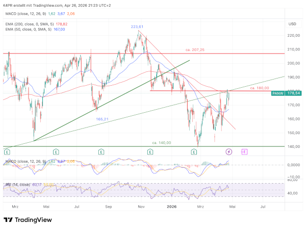 Seit Anfang 2024 bewegt sich die Aktie überwiegend in einer festen Spanne zwischen etwa 140,00 und 224,00 US-Dollar. Innerhalb dieses Bereichs schwankt der Kurs immer wieder. Seit Ende Februar geht es jedoch wieder aufwärts, und zuletzt hat die Aktie eine wichtige Widerstandszone bei rund 180,00 US-Dollar getestet. Diese setzt sich aus dem 200-Tage-Durchschnitt sowie einer weiteren charttechnischen Barriere zusammen.