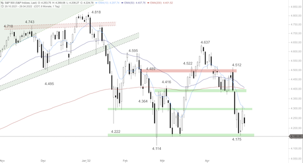 Am Vortag hieß es im Insight: "Die übergeordnete Lage bleibt im S&P 500 weiterhin klar bearish. Mit dem Kursrutsch im Wochenchart unter den wichtigen 50er-EMA hat sich die Lage für den S&P 500 deutlich eingetrübt. Erholungen sollten schnell wieder auslaufen und der übergeordnete Abwärtstrend wieder aufgenommen werden. Neue Short-Positionen bieten sich im Bereich von 4.300 Punkten an."