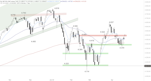 Am Vortag hieß es im Insight: "Die Short-Position wurde eröffnet und ist weiterhin im Rennen. Der S&P 500 könnte nun am Widerstand bei 4.500 Punkten nach unten abprallen und dann zunächst Kurs auf den 10er-EMA nehmen. Darunter wäre dann mit einem Rücklauf bis 4.390 Punkten zu rechnen."