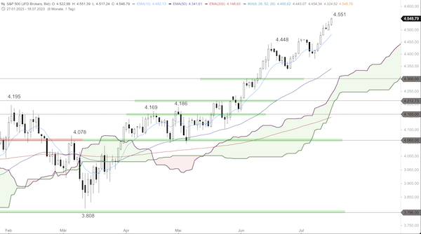 Solange der 10er-EMA im Tageschart bei aktuell 4.482 Punkten nicht unterschritten wird, sind kurzfristig eher weiter steigende Kurse im S&P 500 zu erwarten. Immer wieder wurde auf die starke Überkauftheit im S&P 500 hingewiesen, die sich nun noch weiter erhöht hat. Der Fear & Greed-Index von CNN Business notiert weiterhin im Bereich Extreme Greed, bei aktuell 82 Punkten (bisher 80 Punkten). Diese Überkauftheit wird mittelfristig auch wieder abgebaut werden. Die nächste wichtige Anlaufmarke über 4.550 Punkten wäre der Bereich um 4.600 Punkte. Die Short-Position wurde im Verlust bei 4.550 Punkten ausgestoppt.