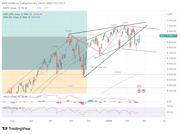 Noch vor wenigen Tagen sah es so aus, als würde der S&P 500 im Bereich von 7.000 Punkten eine Art Hoch ausbilden. Charttechnisch deutete ein steigender Keil auf eine mögliche Trendwende hin. Das damals favorisierte Verkaufssignal wurde jedoch im Bereich von 6.800 Punkten gestoppt.