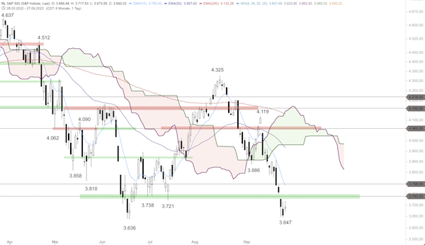 An der Lage hat sich damit zunächst wenig geändert. Es ist zunächst weiter mit einem Kursrückgang bis 3.600 Punkte zu rechnen, hier könnte eine kurze Erholung starten. Diese Erholung könnte dann bis in den Bereich des 10er-EMA laufen, wo sich eine neue Short-Position anbieten würde.