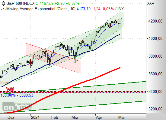 Der Aufwärtstrend ist im S&P 500 noch intakt, allerdings mehren sich jetzt die Abwärtssignale. Solange der S&P 500 unter dem 10er-EMA bleibt, ist mit weiter fallenden Kursen zu rechnen. Die nächste Anlaufmarke ist die untere Begrenzung des steigenden Trendkanals.