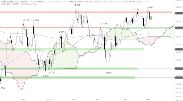 Am Vortag hieß es: "Der S&P 500 sollte das heutige Tagestief nicht mehr unterschreiten und wieder ansteigen. Dabei würde sich die Lage mit einem Anstieg über den 10er-EMA aufhellen. In diesem Fall wäre mit einem weiteren Hochlauf bis 4.160 und erneut in den Bereich von 4.200 Punkte zu rechnen."