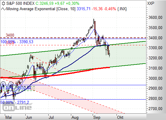 Die Marke von 3.200 Punkten wurde am Vortag mit dem Tagestief bei 3.209 Punkten knapp verfehlt. Nach einer kurzen Aufwärtskorrektur dürfte der S&P500 aber wohl weiter abgeben und in einer neuen Abwärtswelle die Marke von 3.200 Punkten unterschreiten.