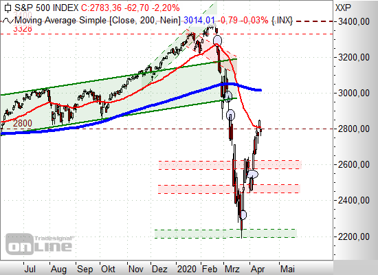 Solange der S&P500 nun also unter der Marke von 2.800 Punkten bleibt, ist mit einem langfristigen Rücklauf zu rechnen. Das erste Kursziel lautet auf 2.300 Punkte, dem genannten noch offenen Gap.