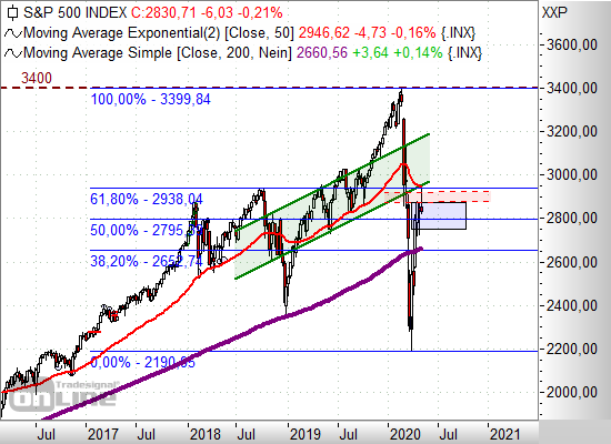 Im vorliegenden Wochenchart ist außerdem zu sehen, wie der US-Index an der unteren Begrenzung des alten steigenden Trendkanals, am 61,8%-Fibonacci-Retracement und am 50er-EMA im Wochenchart abgeprallt ist. Es könnte nun die erwartete neue Abwärtswelle starten. Das Kursziel befindet sich zunächst bei 2.300 Punkten am unteren offenen Gap.