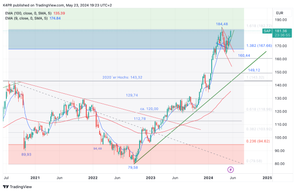 Ein nachhaltiger Ausbruch auf ein neues Allzeithoch sollte der SAP-Aktie weiteres Aufwärtspotenzial verschaffen, in einem ersten Schritt auf 198,04 und anschließend 207,05 Euro. Ein weiteres rechnerisches Kursziel liegt für das SAP-Papier bei 224,83 Euro vor, solange der Wert nicht unter sein bisheriges Allzeithoch von 184,48 Euro abrutscht. Sollte die Aktie aber am Allzeithoch scheitern, dann könnte dagegen ein Doppeltop drohen. Dieses würde aber erst durch einen Rückfall unter 163,82 Euro aktiviert werden. Das rechnerische Ziel läge dann bei 145,47 Euro.