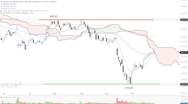 Sollte es zu einem Durchbruch des 10er-EMA über den 50er-EMA kommen, würde zudem ein weiteres Stärkesignal generiert werden. Solange der 50-EMA gehalten werden kann, ist mit einem erneuten Angriff auf die Ichimoku-Wolke zu rechnen, die im weiteren Kursverlauf auch nach oben durchbrochen werden könnte. In diesem Fall würde ein langfristiges Kauf-Signal für die Papiere von Sartorius generiert werden.