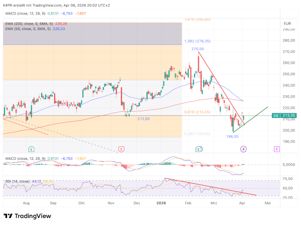 Ein Blick auf die Kursentwicklung zeigt derzeit ein positives Signal: Die Kursbewegung vom Donnerstag deutet auf eine mögliche Fortsetzung des Aufwärtstrends hin. Sollte die Aktie über das Hoch der Vorwoche bei 215,95 Euro steigen, könnte das kurzfristig weiteres Kaufinteresse auslösen. In diesem Fall wäre ein Anstieg in Richtung 226,25 Euro möglich, wo wichtige Durchschnittswerte verlaufen. Das würde einer typischen technischen Erholung entsprechen.