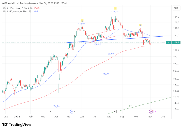 Nachdem sich bei Talanx im Zeitraum zwischen Mitte Mai und Mitte Oktober eine eindrucksvolle SKS-Formation aufgebaut hatte, kam es nur wenige Tage später zu einem deutlichen Kursrückfall unter die dazugehörige Nackenlinie, verlaufend um 109,40 Euro. Dies hat ein größeres Verkaufssignal auf Sicht der nächsten Wochen ausgelöst, ein erstes Ziel, bestehend aus dem 200-Tage-Durchschnitt bei 104,50 Euro, wurde erfolgreich im gestrigen Handelsverlauf abgearbeitet. Aus der Gesamtformation geht aber noch sehr viel höheres Korrekturpotenzial hervor, im weiteren Verlauf auf 99,50 Euro und darunter auf rechnerisch 95,85 Euro und bietet sich weiterhin für ein Engagement auf der Unterseite an. Kurzzeitig dürfte aber der EMA 200 stabilisierend wirken und Kursgewinne auf 108,10 Euro ermöglichen. Dieses Niveau sollten Investoren für einen potenziellen Short-Einstieg vormerken. In bullisches Terrain kehrt die Talanx-Aktie dagegen erst über einem Preisniveau von 116,70 Euro zurück, was angesichts der eklatanten Kursschwäche derzeit als wenig wahrscheinlich erachtet wird.
