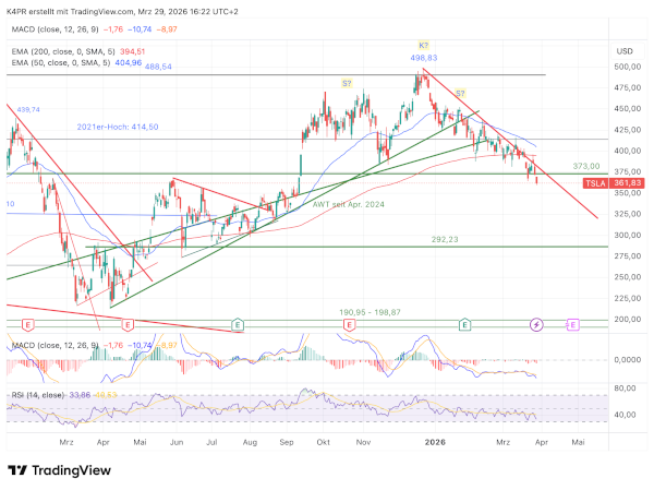 Bereits in einer Analyse vom 23. März 2026 wurde auf eine mögliche Trendwende hingewiesen, die durch eine sogenannte Schulter-Kopf-Schulter-Formation (SKS) bestätigt werden könnte. Ein wichtiges Signal dafür ist das Unterschreiten der sogenannten „Nackenlinie“, die damals bei 373,00 US-Dollar lag. Genau das ist nun passiert: Der Kurs ist unter diese Marke gefallen, was als negatives Zeichen gewertet wird.