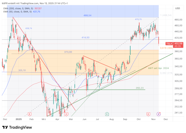 Nach dem letzten großen Kurssprung aus Mitte September auf ein frisches Hoch in der Jahreshälfte bei 470,75 US-Dollar hat sich in der Tesla-Aktie kurzzeitig eine Seitwärtskonsolidierung mit einer dazugehörigen Unterstützung um 414,50 US-Dollar eingestellt. Die letzten Tage über waren von merklichen Gewinnmitnahmen geprägt, die sich am Donnerstag schließlich in einem großen Kursrutsch von über sechs Prozent unter den 50-Tage-Durchschnitt sowie die untere Begrenzung von 414,50 US-Dollar manifestiert haben. Damit liegt aus technischer Sicht nun ein kurzfristiges Verkaufssignal mit Zielen bei 392,37 und darunter 383,76 US-Dollar vor. Namhafte Unterstützungen findet die Aktie jedoch erst bei 373,00 US-Dollar vor, wo gleich zwei wichtige Supports zusammentreffen. Bis dahin könnte sich auf Sicht der nächsten Tage demnach ein Short-Engagement lohnen. Auf der Oberseite müsste mindestens das aktuelle Jahreshoch bei 488,54 US-Dollar mindestens auf Wochenbasis geknackt werden, damit die nächste Zielzone, bestehend aus dem 138,2 % Fibo bei 593,32 US-Dollar, aktiviert werden kann.