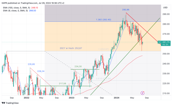 Aus technischer Sicht stellen die Verlaufshochs aus 2021 bei 252,67 US-Dollar und aktueller Support eine günstige Einstiegsgelegenheit strategisch orientierter Anleger dar. Eine erste positive Reaktion ist auf den Test dieser Unterstützung bereits erfolgt, nun könnte auf Sicht der nächsten Monate ein weiterer Aufschwung an das nächstgrößere Ziel gelegen am 161,8 % Fibonacci-Extension-Retracement und der Kursmarke von 300,78 US-Dollar bevorstehen und sich für ein entsprechendes Long-Investment anbieten. Gerät der Wert demnächst aber stärker unter Druck und fällt mindestens auf Wochenbasis unter den EMA 200 (Woche) bei 248,10 US-Dollar zurück, wäre dies ein harter Schlag für die erwartete Aufwärtsbewegung, in der Folge müssten Verlust auf 234,30 und darunter den etwas größeren Support von 228,03 US-Dollar einkalkuliert werden. Weder der RSI noch der MACD stützen aber ein derartiges Ereignis.