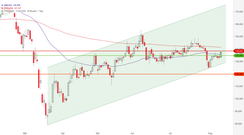 Am Vortag hieß es: "Der Stopp der Short-Position befindet sich aktuell bei 145,00 Euro über dem 200er-EMA und sollte nun schnell auf Einstand und dann in den Gewinn nachgezogen werden. Wird der Short ausgestoppt, könnte sich über dem 50er-EMA im Bereich von aktuell 135,91 Euro eine neue Short-Position anbieten."