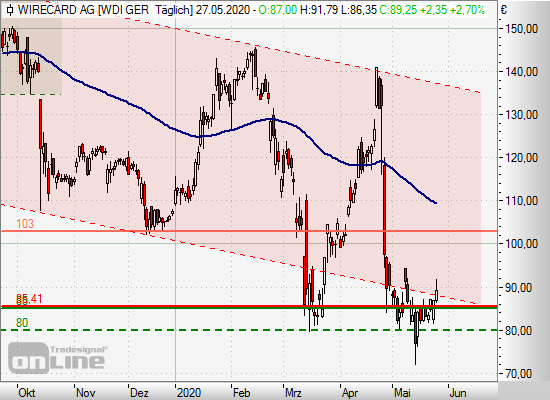 Der Stopp der Long-Position wurde am Vortag etwas unter das Vortagestief nachgezogen und könnte nun bereits auf Einstand oder leicht in den Gewinn gezogen werden. Das Kursziel liegt unverändert bei 103,00 Euro. Sollte die Long-Position ausgestoppt werden, könnte ein neuer Long-Einstieg an der Unterstützung bei 80,00/85,00 Euro erwogen werden.
