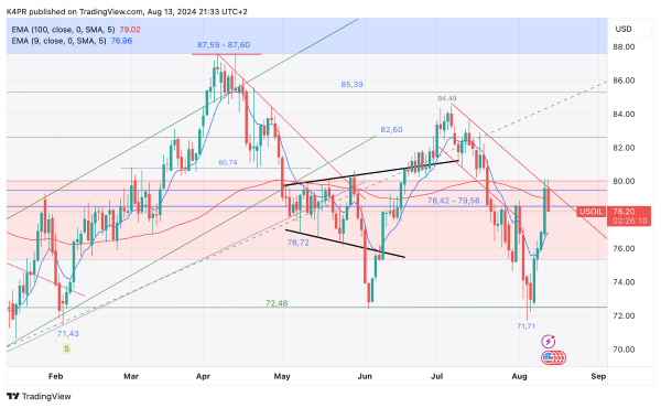 Die rote Tageskerze vom Dienstag könnte weitere Abgabebereitschaft signalisieren, unterhalb von 78,00 US-Dollar würden demnach Abschlagsrisiken zurück auf 77,01 US-Dollar drohen. Im Idealfall stabilisiert sich WTI spätestens um 75,00 US-Dollar und nimmt einen erneuten Angriffsversuch auf den laufenden Abwärtstrend vor. Oberhalb von 80,00 US-Dollar auf Tagesschlusskursbasis würden anschließend Kursgewinne an 82,60 und 84,49 US-Dollar winken. Genau diese Entwicklung könnte für den Aufbau von kurzfristigen Long-Positionen genutzt werden. Unterhalb von 74,80 US-Dollar würde aus technischer Sicht jedoch ein Rückschlag mit Abschlagsrisiken zurück auf die Augusttiefs bei 71,71 US-Dollar drohen. Eine Verschärfung des Nahost-Konflikts gilt als einer der Hauptpreistreiber an der Rohstoffbörse.