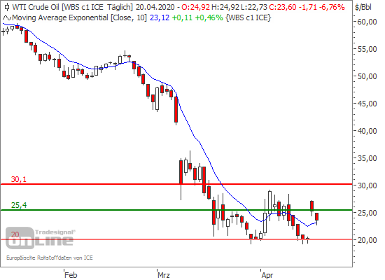 Der Ölpreis für die Sorte WTI könnte wieder bis zur Unterstützung bei 20,00 US-Dollar fallen. Und möglicherweise diesen Bereich auch nach unten durchbrechen und Kurs auf ein neues Verlaufstief nehmen. Vor dem Hintergrund des weltweiten Shutdowns und langfristig neuer Technologien die die Bedeutung des Öls zurückdrängen, dürfte WTI erstmal weiter unter Druck bleiben. Es bietet sich eine Short-Chance.