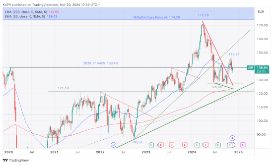 Sobald Airbus wieder ein Niveau von mindestens 143,70 Euro erreicht, steigt die Wahrscheinlichkeit eines Folgeanstiegs an die nächste Widerstandszone um 154,54 Euro merklich an und würde sich für ein entsprechendes Long-Investment auf kurzzeitiger Basis qualifizieren. Eine überschießende Welle könnte sogar an 158,45 Euro heranreichen, ehe wieder einige Tage von Gewinnmitnahmen geprägt werden. Unterhalb der aktuellen Wochentiefs von 135,10 Euro würden allerdings empfindliche Abschläge auf 133,66 und darunter auf 126,50 Euro drohen. Dennoch bliebe ein langfristiger Aufwärtstrend hiervon noch unberührt.