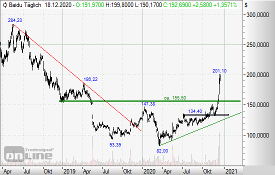 Mitte 2018 markierte die Baidu-Aktie bei 284,23 US-Dollar ihren vorläufigen Höhepunkt, kam anschließend merklich unter Druck und etablierte bis März dieses Jahres einen Abwärtstrend. Vom Niveau um 82,00 US-Dollar aus konnte ein Trendwechsel vollzogen werden, gegen Ende des Jahres stieg das Papier in den markanten und mittelfristig entscheidenden Widerstandsbereich zwischen 147,38 und 155,50 US-Dollar an. Darüber ist Baidu schon längst ausgebrochen und konnte infolgedessen an 200,00 US-Dollar zulegen. In diesem Bereich läuft jedoch seit einigen Tagen eine Seitwärtskonsolidierung, die durchaus einen Pullback bereithalten könnte.