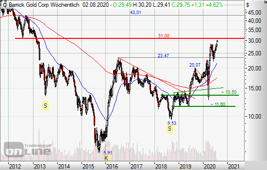 Noch im Jahr 2012 notierte Barrick Gold oberhalb von 31,00 US-Dollar, Anfang 2013 wurde jedoch der schon zuvor begonnene Abwärtstrend fortgesetzt und drückte den Preis auf 5,91 US-Dollar bis Mitte 2015 abwärts. Seither allerdings lässt sich wieder eine klare aufwärts gerichtete Trendrichtung erkennen, in der ersten Jahreshälfte 2020 notierte das Papier trotz Corona-Krise knapp unterhalb des Jahreshochs aus 2016 von 23,47 US-Dollar. Zum Sommer hin und mit anziehenden Goldpreisen konnte sich auch diese Aktie weiterentwickeln und stieg mithilfe des Rekordhochs beim Edelmetall Gold im heutigen Handel direkt an die Hürde aus 2012 um 31,00 US-Dollar an.
