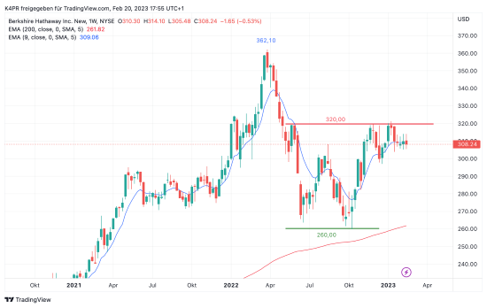 Ein Blick auf den Kursverlauf von Berkshire Hathaway zeigt bis Mai 2021 eine stetige Aufwärtsperformance, dort markierte das Papier um 295,00 US-Dollar einen zwischenzeitlichen Höhepunkt und ging anschließend in eine Seitwärtskonsolidierung über. Im März letzten Jahres gelang es noch einmal dieses Niveau zu übertrumpfen, im selben Atemzug wurde ein Rekordhoch bei 362,10 US-Dollar markiert. Seither hat sich die Aufwärtsdynamik jedoch etwas abgeschwächt und mündete in eine Seitwärtsphase diesmal zwischen 259,85 und grob 320,00 US-Dollar. Ein etwas genauer Blick lässt im Sommer und Spätherbst letzten Jahres allerdings eine astreine W-Formation erkennen, die durch einen weiteren Kurssprung aktiviert werden könnte und dadurch wieder größeres Aufwärtspotenzial entfaltet werden dürfte.