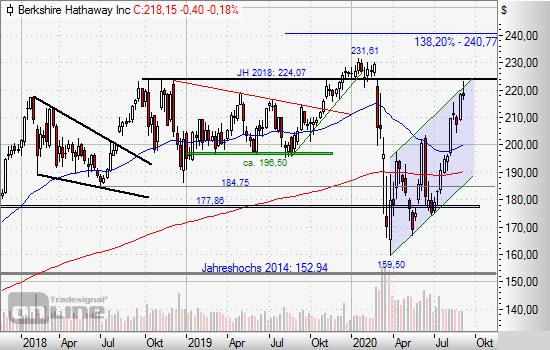 Das Unternehmen Berkshire Hathaway von Star Investoren Warren Buffett hat in den letzten Jahren deutliche Zugewinne verzeichnen können, im Januar markierte die Aktie bei 231,61 US-Dollar ihren vorläufigen Höhepunkt und konnte sich zeitweise über die Jahreshochs aus 2018 hinwegsetzen. Doch der Corona-Krise zwang auch dieses Papier in die Knie, Rückschläge auf 159,50 US-Dollar waren bis Mitte März die Folge. Seither kann das Papier auf eine Erholungsbewegung innerhalb eines breiten Aufwärtstrendkanals zurückblicken und schaffte es in dieser Woche sogar bis knapp an die Jahreshochs aus 2018 bei 224,07 US-Dollar zuzulegen. Solche markanten Stellen werden jedoch häufig von Gewinnmitnahmen begleitet, da ein unmittelbarer Ausbruch anhand der aktuellen Wochenkerze sich nicht abzeichnet und eine gesunde Konsolidierung nun anstehen könnte.