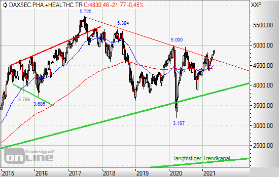 Insgesamt bewegt sich der DAX-Sektor Pharma und Healthcare in einem langfristigen Aufwärtstrend, dieser brachte Kursgewinne bis 2017 auf 5.725 Punkte hervor. Nachdem allerdings die Zugewinne etwas übertrieben worden sind, setzt eine nicht unerwartete Konsolidierung zunächst auf ein Niveau von 3.600 Punkten ein, der Corona-Crash zwang das Barometer dabei sogar auf 3.197 Punkte abwärts. Seitdem allerdings hat sich das Chartbild wieder sichtlich verbessert, auch konnte ein seit 2017 etablierter Abwärtstrend erneut überwunden werden, sodass der Index wieder auf 5.000 Punkte zusteuert. Obwohl es unter technischen Gesichtspunkten bereits zu einem Kaufsignal gekommen ist, sollte für einen Rücklauf zurück an die Rekordstände aus 2017 erst noch das Niveau um 5.000 Punkte nachhaltig geknackt werden.