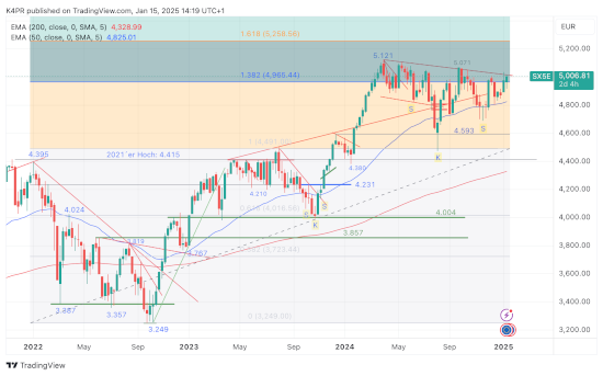 Den letzten markanten Höhepunkt markierte der EuroStoxx 50 bei 5.121 Punkten im April 2024, anschließend ging das Barometer in eine gesunde Konsolidierung über und setzte zeitweise auf die Verlaufshochs aus Sommer 2023 zurück. Dort fanden sich genügend Käufer für eine Stabilisierung ein, allerdings wurde kurzfristig der zuvor eingeläutete Abwärtstrend weiter verfolgt. Innerhalb dieser Phase konnte jedoch eine eindeutig inverse SKS-Formation ausgebildet werden, deren Nackenlinie die obere Abwärtstrendkanalbegrenzung beschreibt. Nun steht offenbar ein unmittelbarer Ausbruch zur Oberseite bevor.