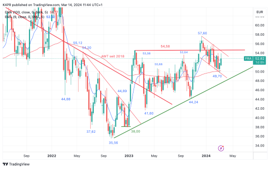 Sowohl die Passagierzahlen als auch das Frachtaufkommen haben im Februar deutlich zugelegt. Letzteres um 4,7 Prozent und die Passagierzahl in Frankfurt um 12,9 Prozent. Eigentlich ein Grund zum Feiern, wären da nicht wieder die gefühlt wöchentlich abgehaltenen Streiks, die für eine Eintrübung der Stimmung unter Anlegern zur Folge haben. Dennoch lässt sich für die Fraport-Aktie übergeordnet seit einem Verlaufstief bei 35,56 Euro aus Oktober 2022 ein positives Bild zeichnen, ein Abwärtstrend bestehend seit 2018 konnte überwunden werden, nun hält sich das Papier in einem temporär abwärtsgerichteten Trend auf, der an dieser Stelle als bullische Flagge gewertet werden kann. Ein Ausbruch darüber würde entsprechend wieder mittelfristiges Kurspotenzial freisetzen.