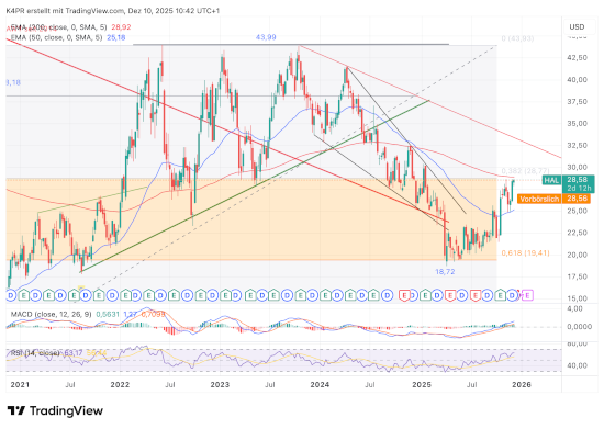 Halliburton markierte den letzten markanten Höhepunkt bei 43,99 US-Dollar Mitte Oktober 2023, nachdem zuvor zwei Anstiegsversuche über diese Hürde gescheitert waren. In 2024 schwenkte der Wert in einem Abwärtstrend ein und verfolgte diesen bis März dieses Jahres, in der Folge kamen Verluste auf 18,72 US-Dollar zustande. Exakt am 61,8 % Fibo erfolgte ein Trendwechsel, Halliburton stieg in den Bereich des EMA 200 an und konsolidiert seit einigen Wochen grob seitwärts. Für ein Folgekaufsignal muss aber diese Hürde jetzt unbedingt überwunden werden.