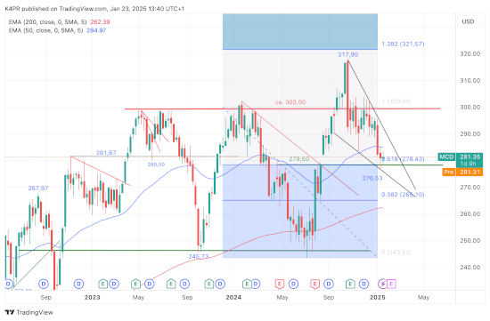 Zu dem besagten 61,8 % Fibonacci-Retracement gesellt sich aktuell noch ein bullischer Keil hinzu, der sehr häufig zur Oberseite aufgelöst wird. Gelingt es demnach Kurse von über 290,80 US-Dollar in der McDonald’s-Aktie zu implementieren, würde dies Hinweise auf einen Rallyeansatz mit vorläufigen Zielen bei 306,95 und schließlich dem Vorgängerhoch bei 317,90 US-Dollar liefern. In diesem Fall könnte sogar das ursprüngliche Ziel am 138,2 % Fibo noch erreicht werden. Eine positive Auflösung würde sich demnach für einen spekulativen Einstieg auf der Oberseite anbieten. Wird das Papier dagegen auf der Unterseite durchgereicht und etabliert zugleich einen Wochenschlusskurs unterhalb von 275,00 US-Dollar, müssten weitere Rückläufer in den Bereich des 200-Wochen-Durchschnitts sowie das 38,2 Fibo bei 265,10 US-Dollar zwingend eingeplant werden.