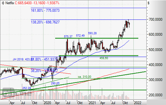 Aktien von Netflix haben nach Ausbruch aus der Schiebezone der letzten Jahre zwischen 458,60 und grob 572,50 US-Dollar wie erwartet eine Aufwärtsbewegung an die nächstgrößere Zielzone um das 138,2 % Fibonacci-Retracement um 700,00 US-Dollar vollziehen können. Jetzt hat sich dort allerdings eine nicht unerwartete Konsolidierung eingestellt, diese könnte sogar zurück auf das Ausbruchsniveau abwärts reichen und würde hierdurch neuerliche Handelsansätze eröffnen. Zweifelsfrei sollten bestehen Long-Positionen nun enger abgesichert werden.