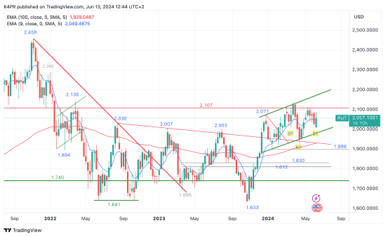 Ein Durchbruch über das Widerstandsband zwischen 2.100 und 2.135 Punkten auf Wochenschlusskursbasis könnte den Russell 2000 Index auf Sicht der nächsten Monate ein Kaufsignal mit einem mittelfristigen Ziel bei 2.288 Punkten bescheren und sich damit für ein Long-Investment qualifizieren. Eine Verlustbegrenzung kann nach heutigem Stand um 2.065 Punkten anvisiert werden, hängt aber noch maßgeblich von der Kursentwicklung der nächsten Tage und Wochen ab.