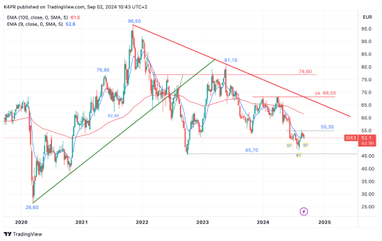 Seit dem Rekordhoch von 96,50 Euro aus November 2021 blickt das Sixt-Papier auf einen intakten Abwärtstrend zurück, hierbei fielen die Notierungen bis Oktober 2022 auf 45,70 Euro zurück. Eine anschließende Erholungsbewegung reichte an 81,10 Euro, seit Mai letzten Jahresheft herrscht aber wieder ein mittelfristiger Abwärtstrend und drückte die Notierungen im August in die Nähe der 2022‘er Tiefs abwärts. Betrachtet man jetzt lediglich die Kursentwicklung seit Anfang Juni dieses Jahres, erinnert der Kursverlauf stark an eine inverse SKS-Formation, deren rechte Schulter sich derzeit noch im Aufbau befindet.