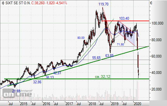 Bis Mitte 2018 lief es für den Autovermieter gemessen an der Kursentwicklung glänzend, das Papier stieg auf ein Verlaufshoch 119,70 Euro an. Dann kam aber der erste kleine Flash-Crash und drückte Sixt zurück auf 63,85 Euro, nach einer kurzfristigen Erholung an 103,40 Euro gaben die Notierungen erneut nach und gingen in den bereits bekannten Crash zu Beginn dieses Jahres über. Dabei setzte das Papier auf das Unterstützungsniveau aus 2014/2015 um 32,00 Euro zurück und bemüht sich an dieser Stelle an einer sichtlichen Stabilisierung. Gelingt diese, könnte sogar ein Handelsansatz auf der Oberseite auf Sicht der nächsten Tage entspringen. Spekulativ bleibt aber dennoch jegliches Investment in der aktuellen Marktphase.