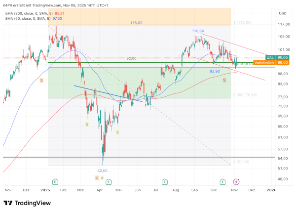 Obwohl sich die Aktie von United Airlines derzeit in einem temporären Abwärtstrend seit Anfang September aufhält, kam es zu keinen größeren Gewinnmitnahmen, ganz im Gegenteil. Die Aktie schaffte es im Unterstützungsbereich von rund 92,00 US-Dollar wieder anzuspringen und bekräftigt den laufenden Abwärtstrend als potenziell bullische Flagge mit der Aussicht auf ein neuerliches Kaufsignal bei einem nachhaltigen Ausbruch auf der Oberseite.