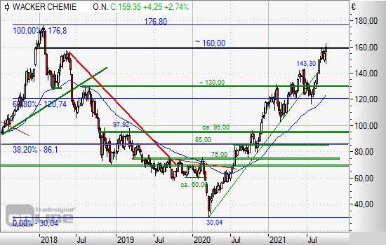 Die Verluste der letzten Jahre hat die Wacker Chemie-Aktie im abgelaufenen und diesem Jahr nahezu vollständig aufgeholt, der Widerstandsbereich um 160,00 Euro bremst das Papier kurzzeitig aber aus. Nichtsdestotrotz sind keine Umkehrsignale zu erkennen, eine Fortsetzung der Rallye ist damit sehr wahrscheinlich und kann für ein letztes Long-Investment genutzt werden. Bestehende Positionen sollten allerdings nun enger abgesichert werden.