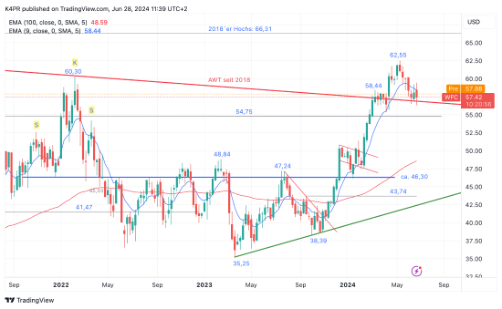 Die seit nunmehr März 2023 anhaltende Kursrallye bei Wels Fargo brachte Kursgewinne von 35,25 auf 62,55 US-Dollar hervor, dies entspricht einem Kursanstieg von 77 Prozent bis Mitte Mai dieses Jahres. Hierbei gelang es im Frühjahr einen seit 2018 bestehenden Abwärtstrend zu überwinden und damit ein Folgekaufsignal an die Verlaufshochs aus 2018 zu generieren. Die aktuelle Konsolidierungsphase ist als gewöhnlicher Pullback zu werten, Anstiegschancen hält sich das Papier hierdurch weiter offen. Schwäche sollte die Aktie jedoch nicht mehr zeigen, weil dies im Anschluss und bei weiteren Abschlägen eine ungemütliche Umkehrformation aktivieren könnte.