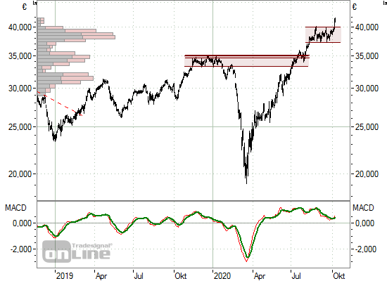 Die Aktie konnte sich dem allgemeinen Einbruch im März zwar nicht entziehen, allerdings gelang der Anstieg auf ein neues Allzeithoch bereits im Juli. Auf die bis im August erfolgte Rally schloss sich zuletzt eine klar erkennbare Konsolidierung mit den Grenzen 37,550 Euro nach unten bzw. 40,00 Euro nach oben an. Aus dieser "Schiebezone" ist der Titel mit den angehobenen Gewinnerwartungen signifikant nach oben ausgebrochen und dürfte damit die zuletzt unterbrochene Rally weiter fortsetzen. Als nächste Hürde zeigt sich aktuell zwar das Hoch vom Mittwoch bei etwa 42 Euro, dieses sollte aber rasch überwunden werden. In den kommenden Wochen rechnen wir dann mit weiteren Bewegungen in historisches Kursneuland nach oben. Sollte sich die Dynamik dabei weiter fortsetzen, halten wir ein baldiges Erreichen der nächsten runden Marke von 50 Euro für möglich.