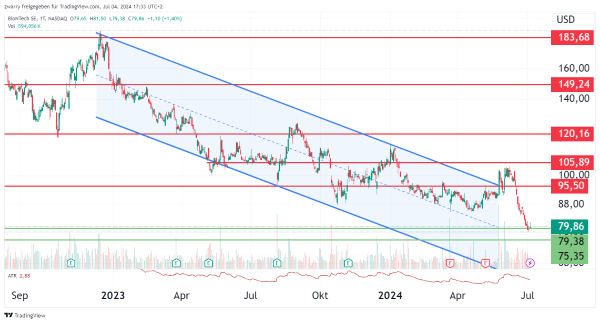 Der Aktienkurs von BioNTech markierte das All Time High am 10. August 2021 am Level von 464,00 US-Dollar. Ab diesem Zeitpunkt war das Papier im Schnitt höherem Verkaufsdruck ausgesetzt. So wechselten sich Abwärtssequenzen und Seitwärtskonsolidierungen ab, was in der Spitze zu einem Kursverlust von 83 Prozent geführt hat. Am vergangenen Mittwoch schloss die Aktie bei 79,86 US-Dollar. Am 30. Mai 2024 hatte es den Anschein, als ob der zu dieser Zeit gültige Abwärtstrend überwunden werden könnte. Am 6. Juni gewannen aber wieder die Bären die Oberhand, was kurzfristig zu einem Kurseinbruch um gut 23 Prozent auf 79,86 US-Dollar geführt hat. Bis dato sind im Jahr 2024 auch das Ergebnis pro Aktie ins Minus gerutscht. Dennoch sitzt BioNTech auf einem Berg voll Geld im Ausmaß von 12,88 Milliarden US-Dollar. Die Wahrscheinlichkeit, dass die derzeitige Forschung wieder zu höheren Einnahmen und zu Gewinnen führt, ist sehr groß. Auch der Aktienkurs ist aktuell in die Widerstandszone zwischen 79,38 und 75,35 US-Dollar gerutscht. Dies könnte zu einer Beruhigung oder sogar zu einer Gegenbewegung führen.