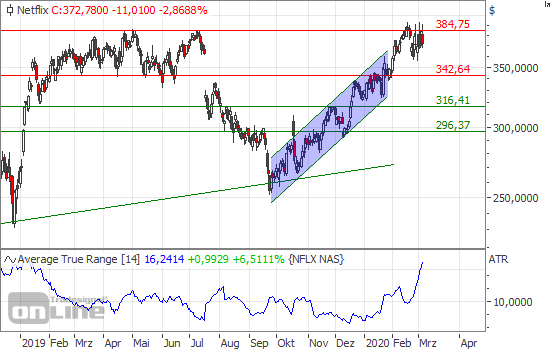 Die am 17. Januar 2019 vorgestellte Idee, mit einem Call-Optionsschein (WKN MF9U0K) mit dem Basispreis von 340 US-Dollar und Fälligkeit am 16.12.2020 auf eine steigende Aktie von Netflix zu setzen, schloss gestern zum Geldkurs von 6,90 Euro und lag mit 51,60 Prozent im Plus. Wer den Gewinn nicht mitnehmen, sondern in Erwartung steigender Kurse hier investiert bleiben möchte, könnte den Stoppkurs im Basiswert auf 361,51 US-Dollar nachziehen, so dass sich im Optionsschein ein neuer Stoppkurs bei 6,19 Euro ergibt. So könnte diese Position über break even abgesichert werden.