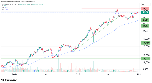 Der Aktienkurs der Commerzbank befand sich bis zum 19. März 2025 in einem deutlichen Aufwärtstrend. Anfang April führte der sogenannte Liberation-Day zu einem kurzfristigen Kurseinbruch von rund 30 Prozent auf 17,45 Euro. Dieser Rückgang verlief „V“-förmig, sodass die Aktie anschließend wieder zulegte und am 22. August 2025 ein 14-Jahreshoch bei 38,40 Euro erreichte. Aktuell notiert die Commerzbank-Aktie mit 35,32 Euro etwa 8 Prozent unter diesem Hoch. Im langfristigen Vergleich befindet sich der Aktienkurs seit dem Allzeittief am 16. März 2020 bei 2,80 Euro in einer übergeordneten Aufwärtsbewegung. Die Erholung beschleunigte sich ab dem Bekanntwerden des Übernahmeversuchs durch die Unicredit im September 2024, was zu einem Kursanstieg von rund 115 Prozent führte. Seit dem 14-Jahreshoch bei 38,40 Euro korrigierte die Aktie jedoch bis zur Unterstützung bei 29,54 Euro und bildete auf dieser Basis eine kurze Aufwärtssequenz. Diese Sequenz ist derzeit noch intakt und könnte zu einem Test des Niveaus bei 42,01 Euro führen. Einen erheblichen Einfluss auf Bankaktien hat der Leitzins für Europa. Dieser wurde am gestrigen Mittwoch von der Europäischen Zentralbank (EZB) veröffentlicht. Die Zentralbank beließ den Hauptrefinanzierungssatz bei 2,15 Prozent und den Einlagezinssatz bei 2,0 Prozent. Der Aktienkurs reagierte daraufhin kaum verändert.