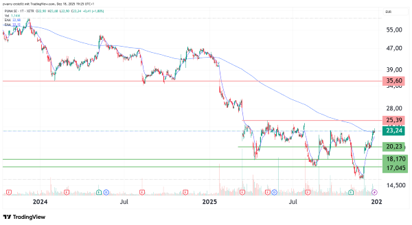 Die am 31. Oktober 2025 vorgestellte Idee, mit einem Call-Optionsschein (WKN JU4997) mit dem Basispreis von 25,00 Euro auf die Puma SE zu setzen, notiert zur Stunde zum Geldkurs von 0,26 Euro und liegt mit 136 Prozent im Plus. Die Bullen haben aktuell bei der Aktie von Puma ihr Pulver verschossen, nachdem die Aktie an der 200-Tage Linie ansteht. Es ist daher ratsam, den Gewinn mitzunehmen.