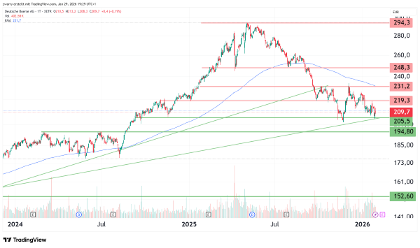 Die Aktie der Deutschen Börse AG hat seit ihrem Rekordhoch von 294,30 Euro am 5. Mai 2025 einen beispiellosen Absturz hingelegt. Das Papier hat seitdem 30 Prozent an Wert verloren. Damit wurde eine Marktkapitalisierung von rund 16 Milliarden Euro ausgelöscht. Dennoch scheint sich rund um die Unterstützung bei 205,50 Euro ein Boden zu bilden. Damit ist wieder das Kursniveau von Mitte September 2024 erreicht und der Kurszuwachs bis zum Allzeithoch bei 294,30 Euro am 5. Mai 2025 hat sich aufgelöst. Bestätigt sich die Verteidigung der Unterstützung bei 205,50 Euro, könnte der Kurs bis 231,20 Euro steigen. Mittlerweile ist das erreichte Kursniveau wieder für ein Long-Investment attraktiv. Es fehlt nur noch der richtige Auslöser, um wieder für steigende Kurse zu sorgen. Gelangen wieder die Bären ans Ruder, könnte der Kurs endogen bis zur Unterstützung bei 194,80 Euro fallen. Exogene Schocks in Form eines "Schwarzen Schwans" sind jederzeit möglich und könnten auf den Kurs drücken. Fundamental betrachtet erscheint das erwartete KGV 2026 bei 17,68 unter den vergangenen elf Ausprägungen, was ein bullisher Faktor sein könnte. Das in der näheren Zukunft geschätzte Wachstum des Bilanzgewinns pro Aktie sorgt weiter für sinkende KGVs. So wird das erwartete KGV 2028 auf ein Niveau von 14,26 geschätzt.