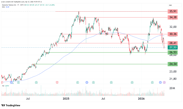 Von einer Verschmelzung erhoffe sich die Telekom offenbar einen Schub für den Unternehmenswert insgesamt. Ab Mitte März 2022 bis zum Allzeithoch am 3. März 2025 bei 35,91 Euro zeigte die Kursentwicklung der Deutschen Telekom eine deutliche Aufwärtsdynamik. Wesentlichen Anteil daran hatte die schrittweise Integration der Tochtergesellschaft T-Mobile US. Die positiven Wachstumszahlen aus den USA stärkten auch die Muttergesellschaft in Deutschland. Besonders bemerkenswert ist die Kurssteigerung vom 17. April 2024 bis zum 3. März 2025, in der der Kurs um rund 58 Prozent zulegte. Ab dem 3. März 2025 trat der Aktienkurs in eine Konsolidierungsphase ein, die von Anfang November 2025 bis Ende Januar 2026 in eine Bodenbildung überging. Anschließend setzte eine erneute Phase starker Kurszuwächse ein, die aktuell schon wieder kompensiert worden ist. Mittlerweile ist der Kurs wieder in die Unterstützungszone zwischen 16,53 Euro und 28,41 Euro gefallen. Hier könnte die Aktie einen Boden ausbilden und zum Sprung nach oben ansetzen, um der Hoffnung auf einen gesteigerten Firmenwert gerecht zu werden.